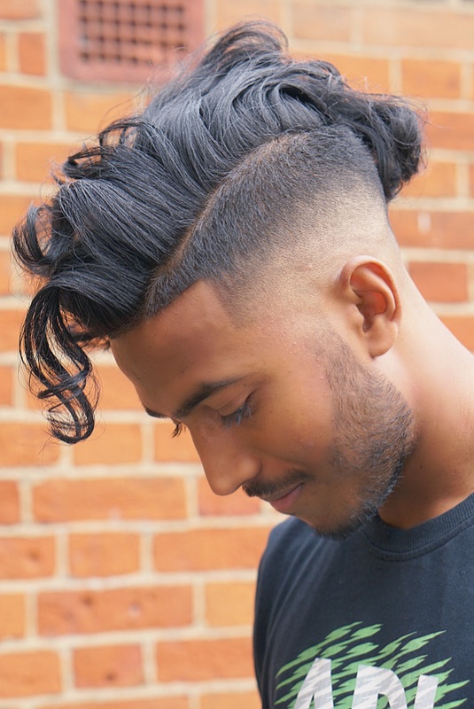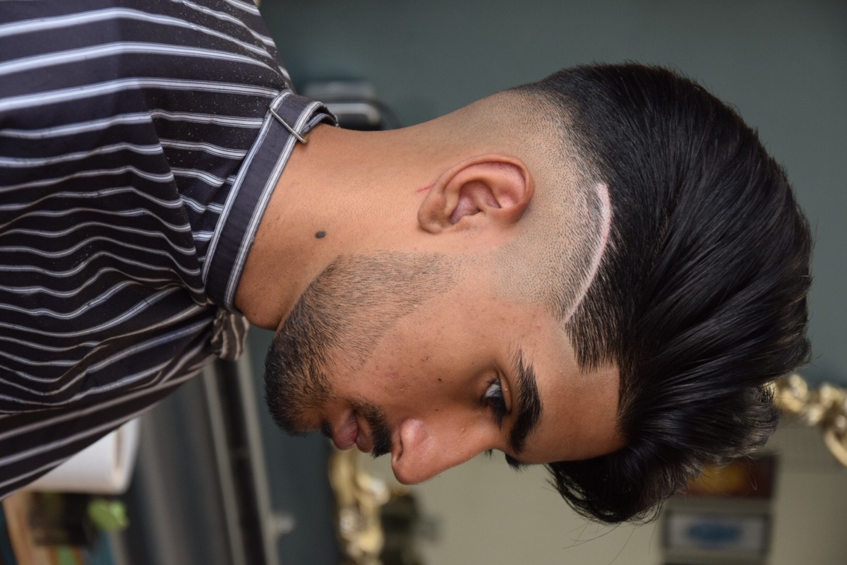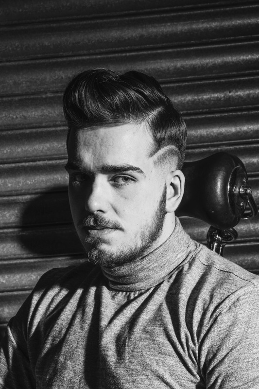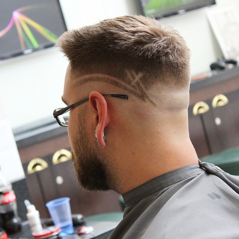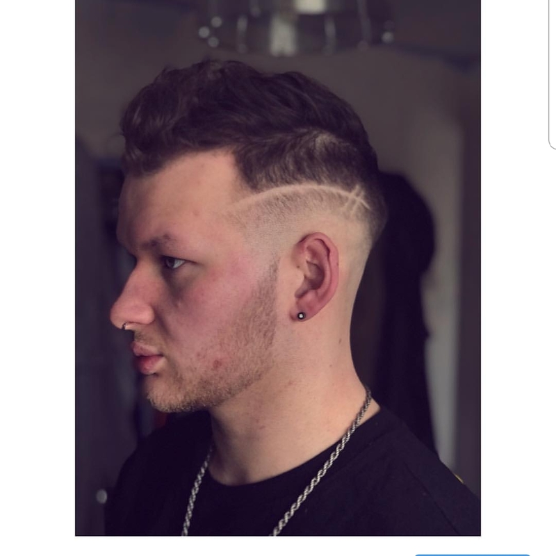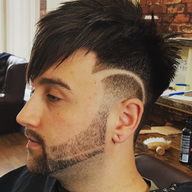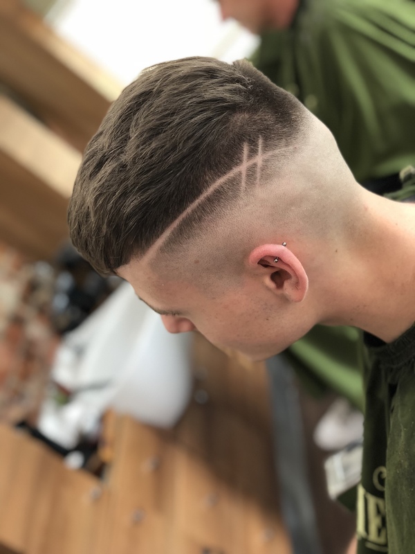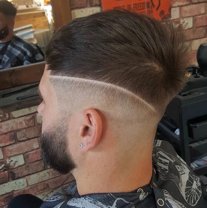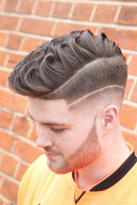 Here we have a classic pompadour, with a edgy pattern to turn heads, finished with a razor skin fade.