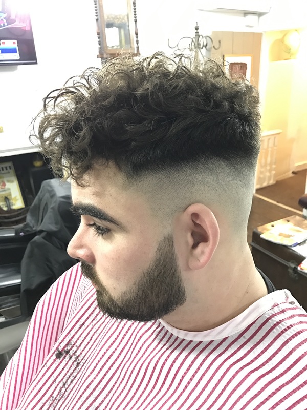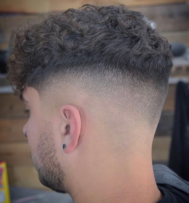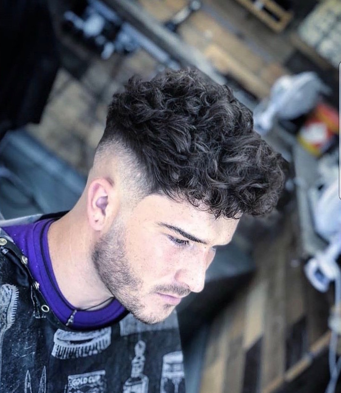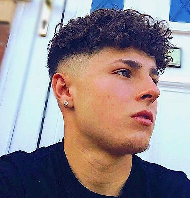 Hard parting with a clean fade leaving a curly natural top