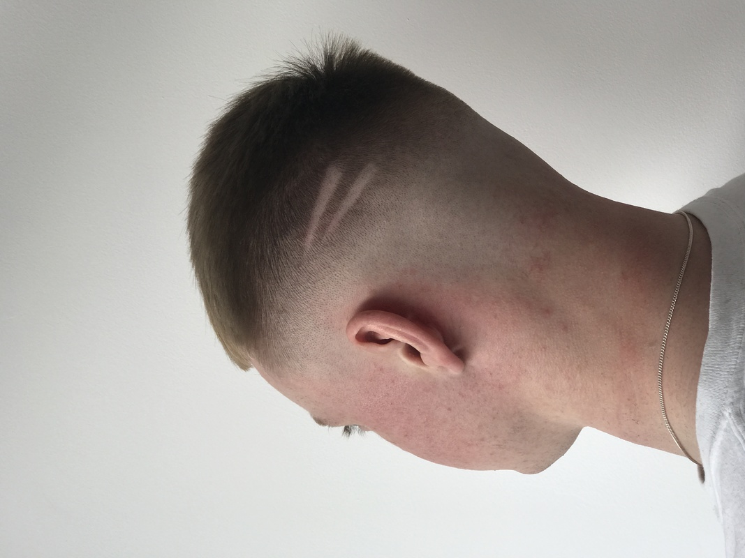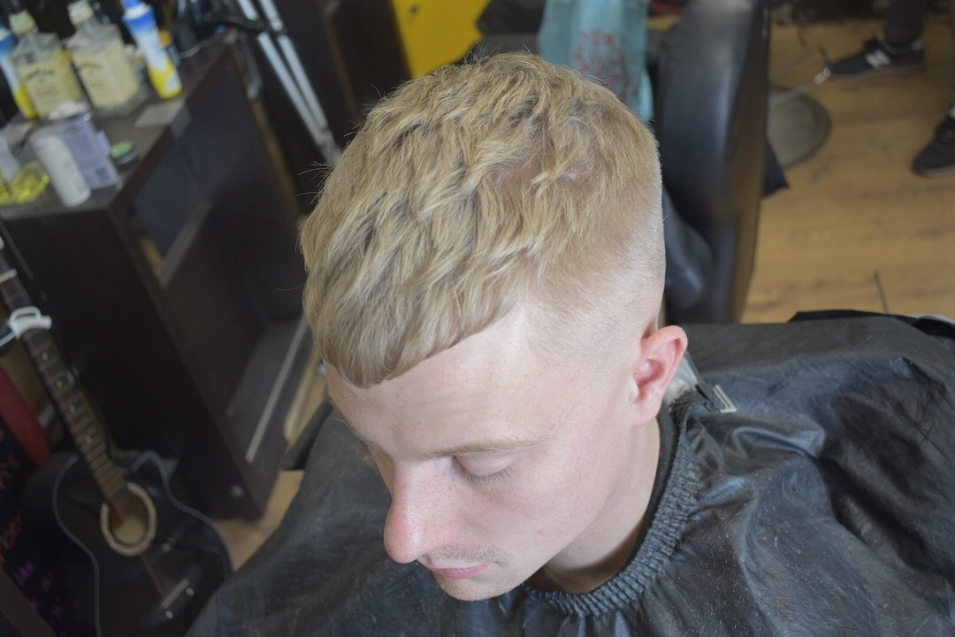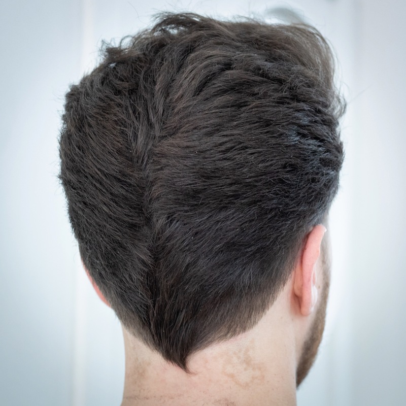 Bald fade finished with two slices. Textured throughout apex.