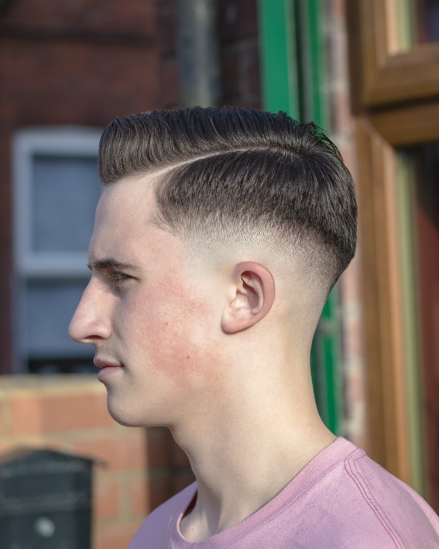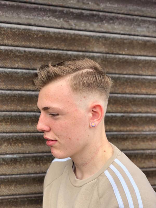 Skin Fade with a hard parting. Slightly textured top then blow dried into a quiff style