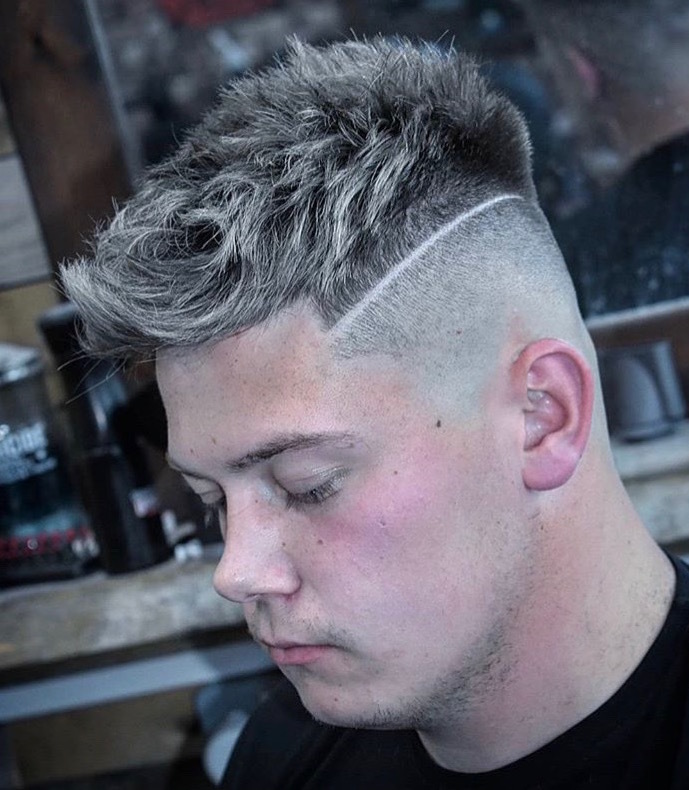 Kids pompadour fade with lines on the side and some funky hair colour spray