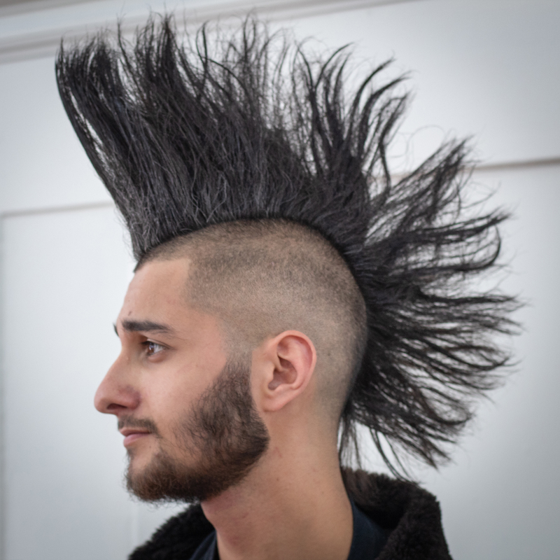 Asymmetric cropped fringe with spiked texture and shaved pattern.