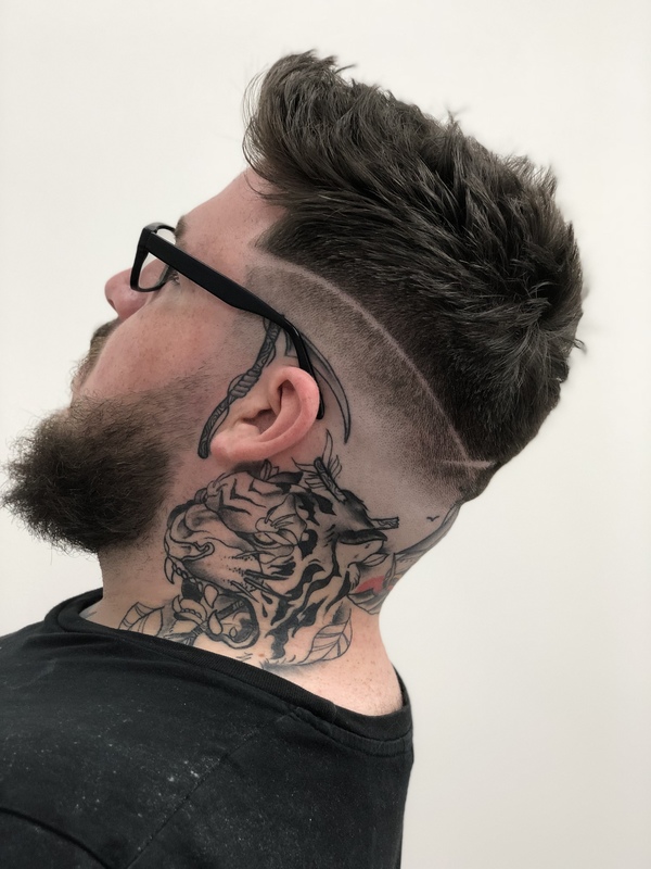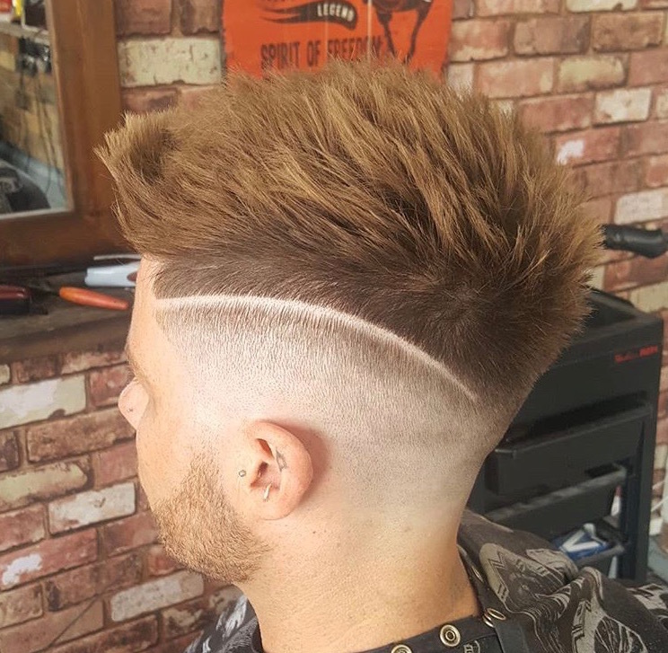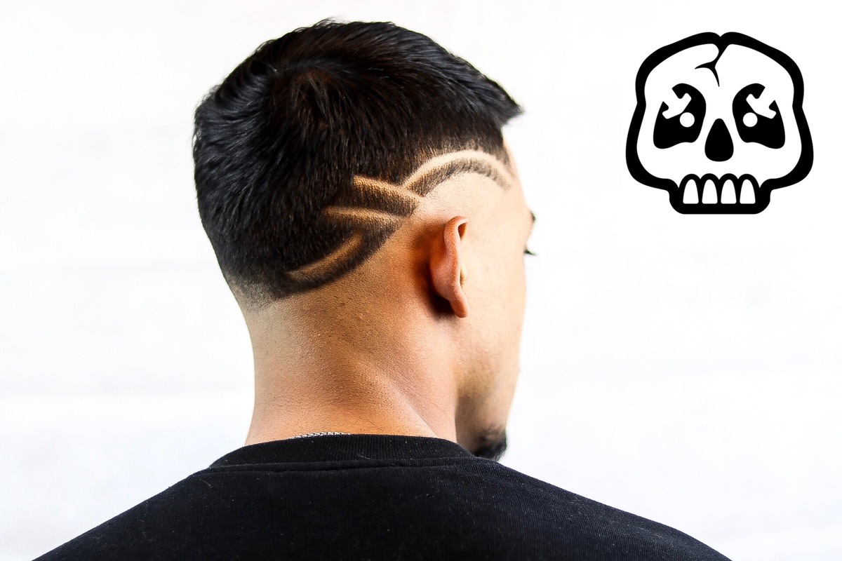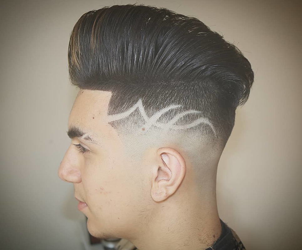 Here we have a classic pompadour, with a edgy pattern to turn heads, finished with a razor skin fade.