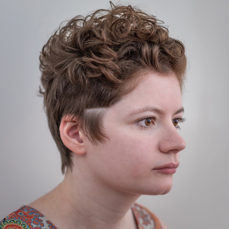 Bald fade sides. Diffuser blow dried to enhance curls and waves.