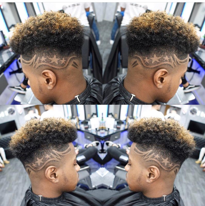 lowish skin fade into curls defused on top with cat scratches and reverse scratches
