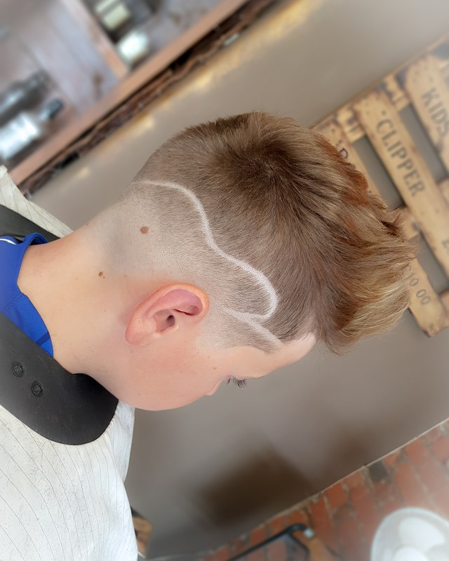 Kids pompadour fade with lines on the side and some funky hair colour spray