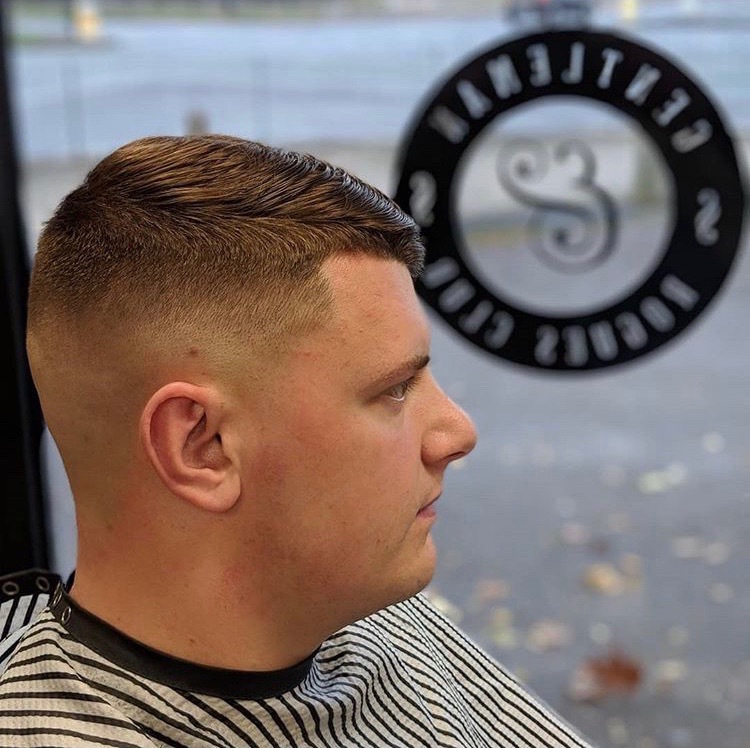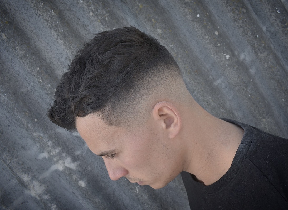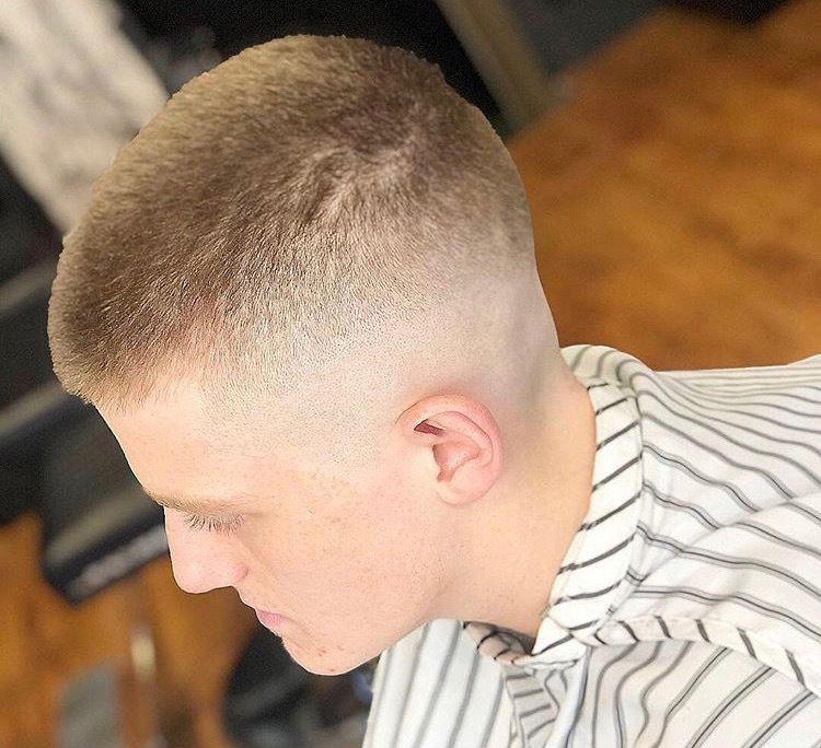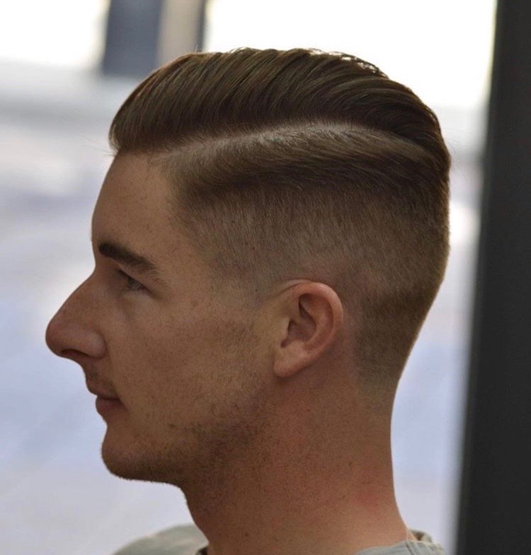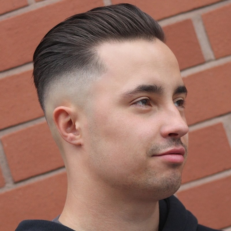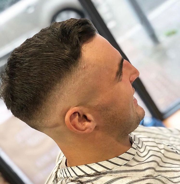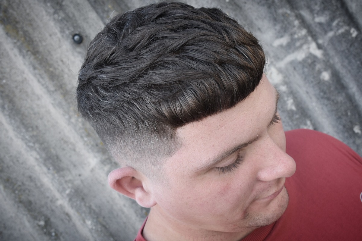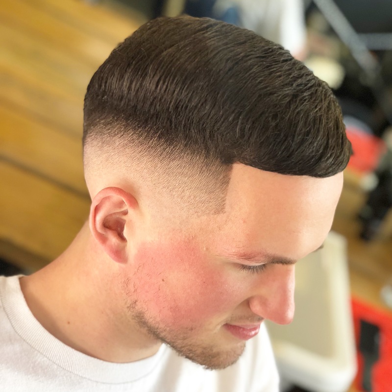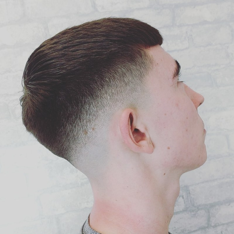 Fade on the sides and back accordingly to the structure of the head and natural flow to the hair on top with no product.