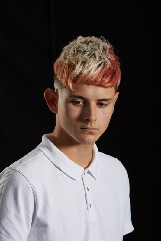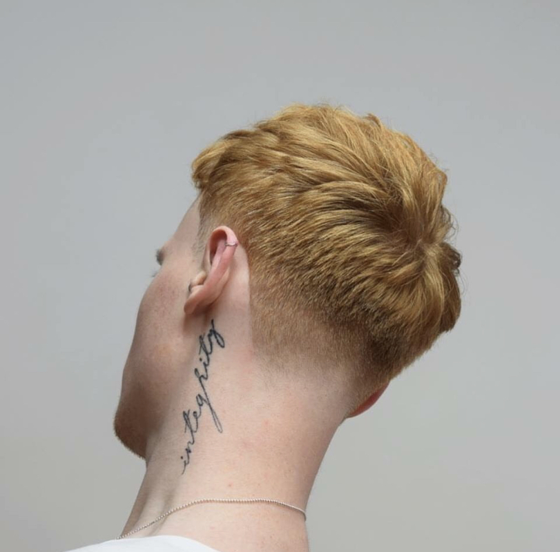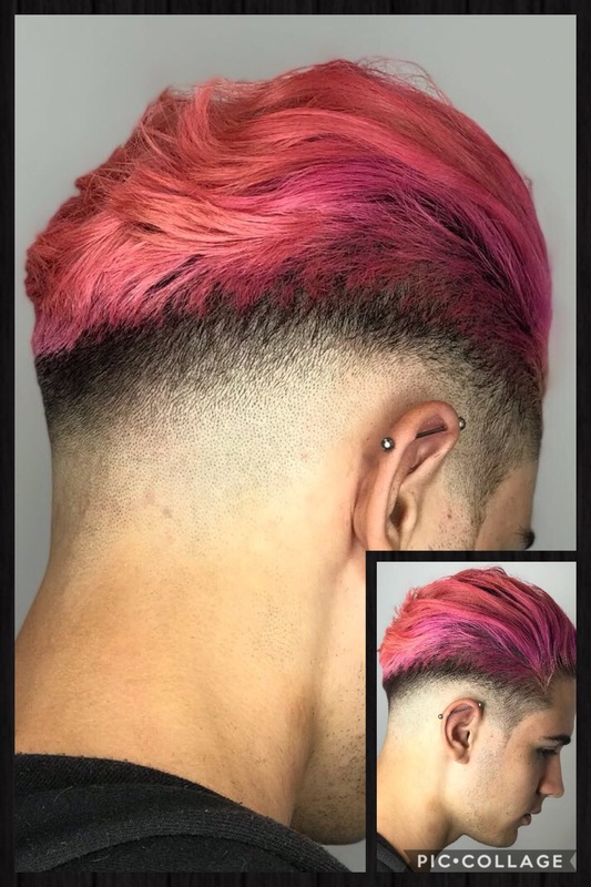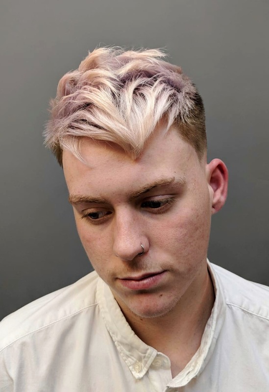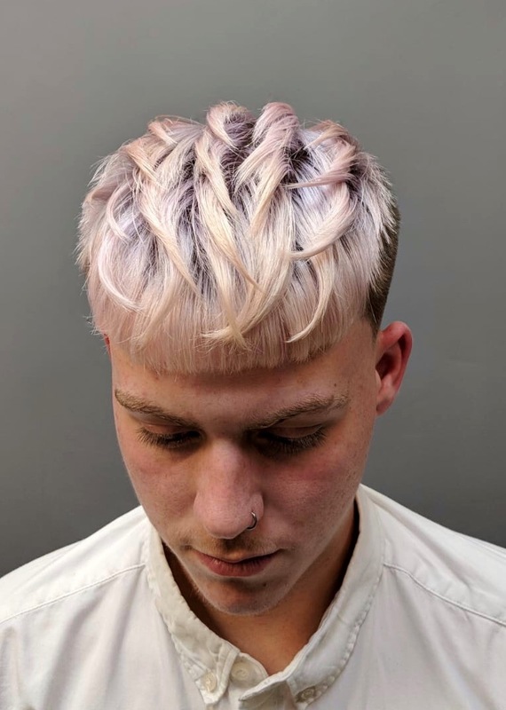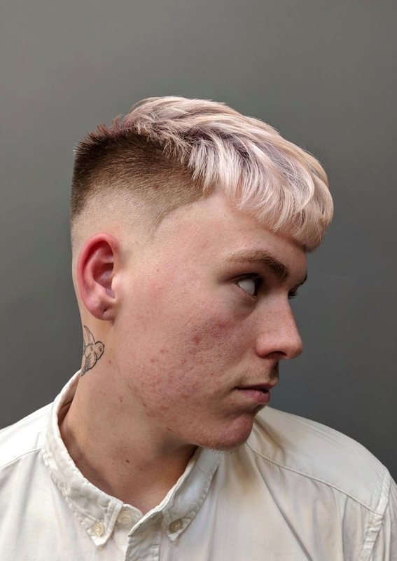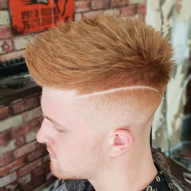 Mid skinfade with loads of texture and movement on top. Pre bleached and coloured with Fiudge colour mix Mahogony, brunette and blond mixer to create this unique colour.