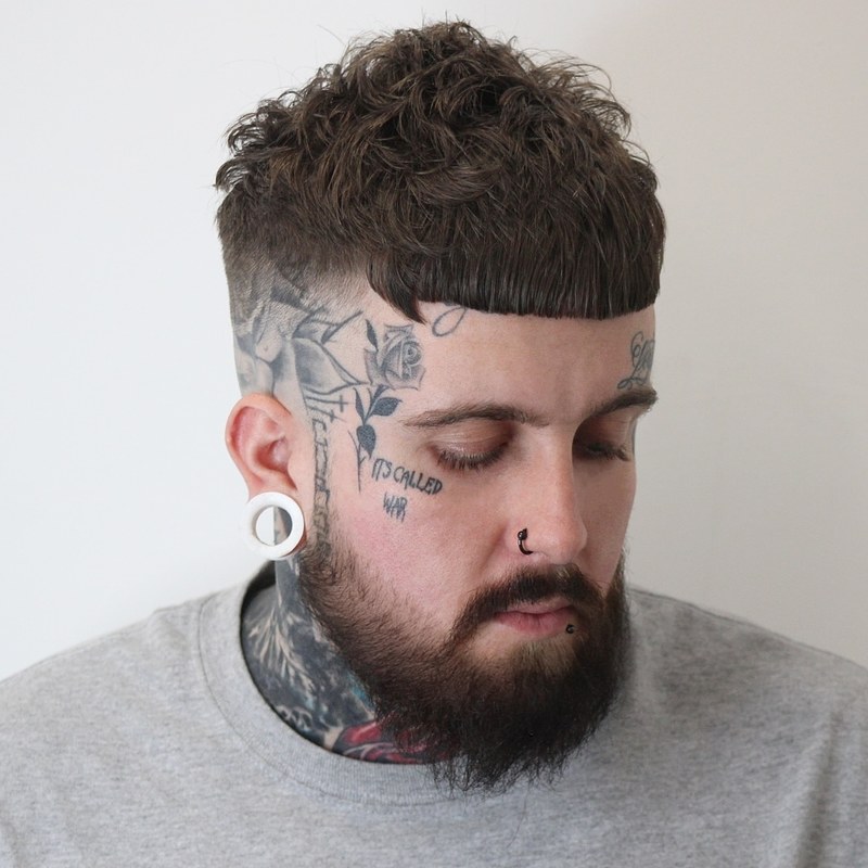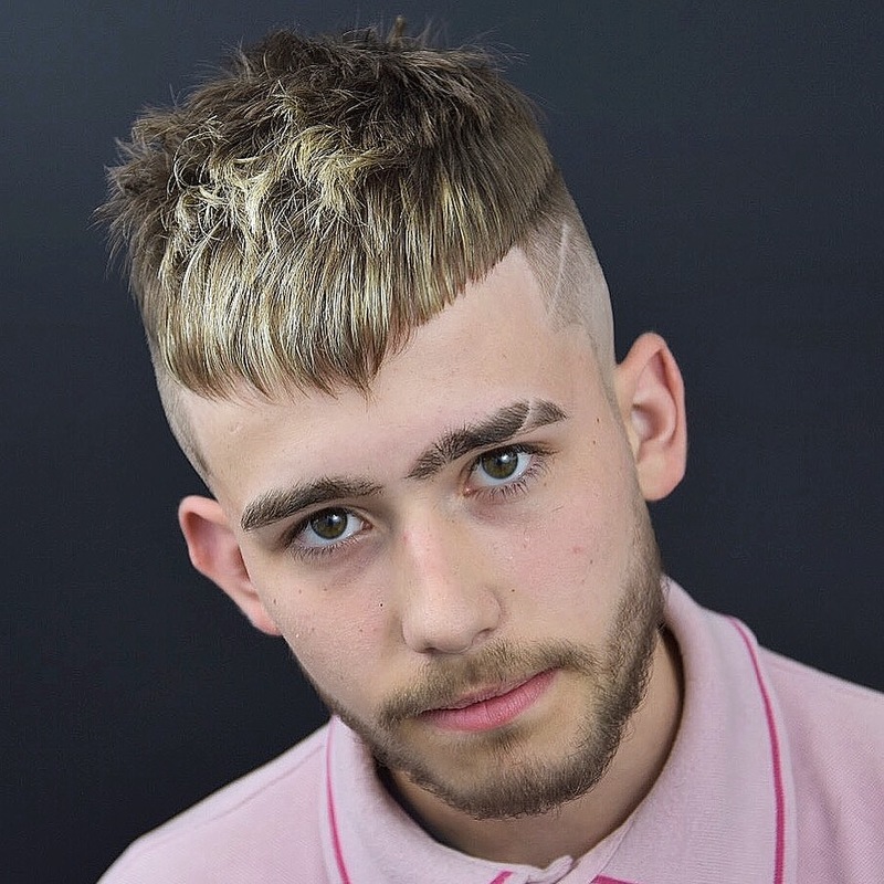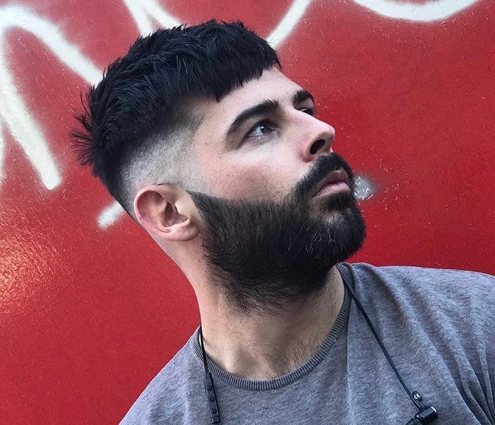 Undercut fade with a choppy top, blunt fringe plus a little cross and a sharp beard