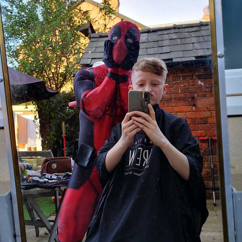 Attempted my son's entire haircut dressed as Deadpool, or in my case Dadpool